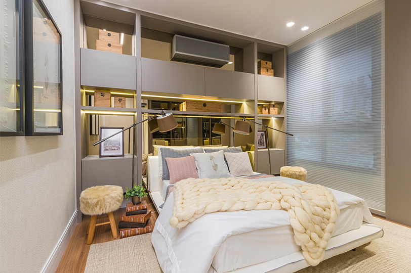 - O estímulo visual está cada vez mais presente na influência de sensações, percepção e até mesmo influencia em compra. Como no apartamento decorado do Artsy, também em Curitiba, com texturas nas roupas de cama e tons rosados;