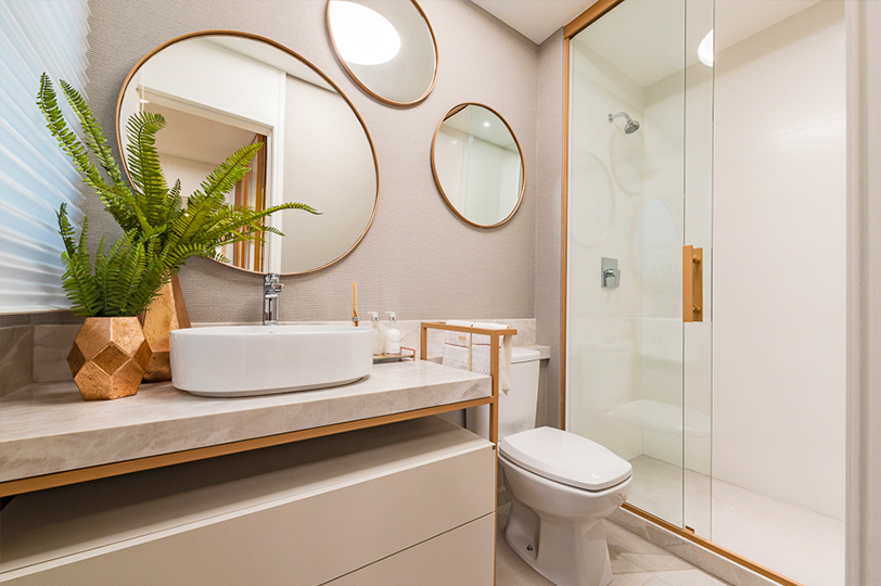 - As cores podem ser usadas em detalhes da decoração, como objetos decorativos, detalhes de roupa de cama, alguma peça específica na mobília, ou um detalhe de revestimento de parede. No banheiro do apartamento decorado do The Edge, em Londrina, é possível encontrar os tons nos objetos.